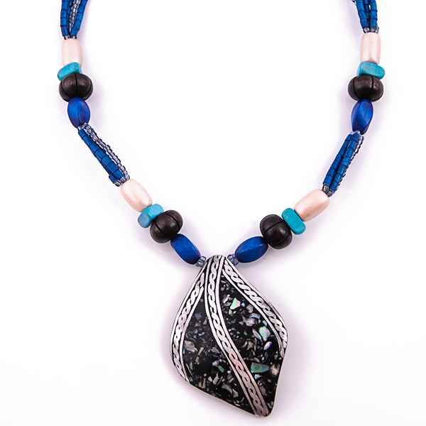 Пальмовое дерево, кокос, перламутр, бисер, текстиль. Гальваническое покрытие: родий.