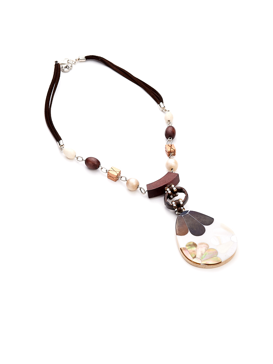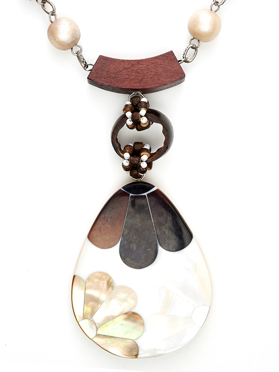 Палисандровое дерево, натуральный перламутр, бисер, экокожа, латунь. Гальваническое покрытие: родий.