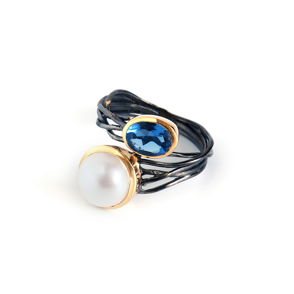 Топаз, искусственный жемчуг, латунь. Гальваническое покрытие: золото, черненый родий.стразы
