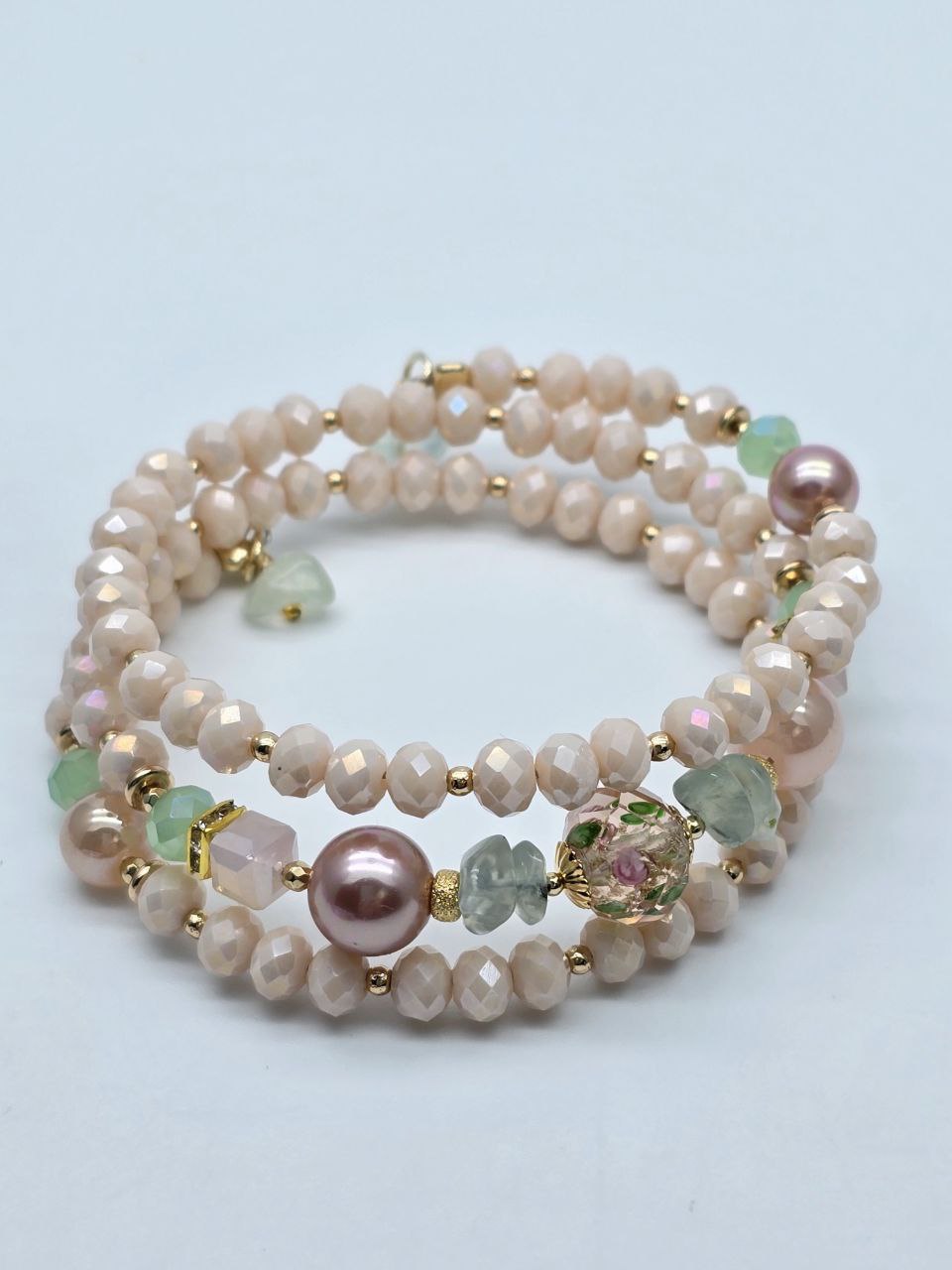 Браслет регулируется по ширине запястья. Диаметр браслета 6,5 см. Художественное стекло 12мм, жемчуг Майорка 8;10 мм.