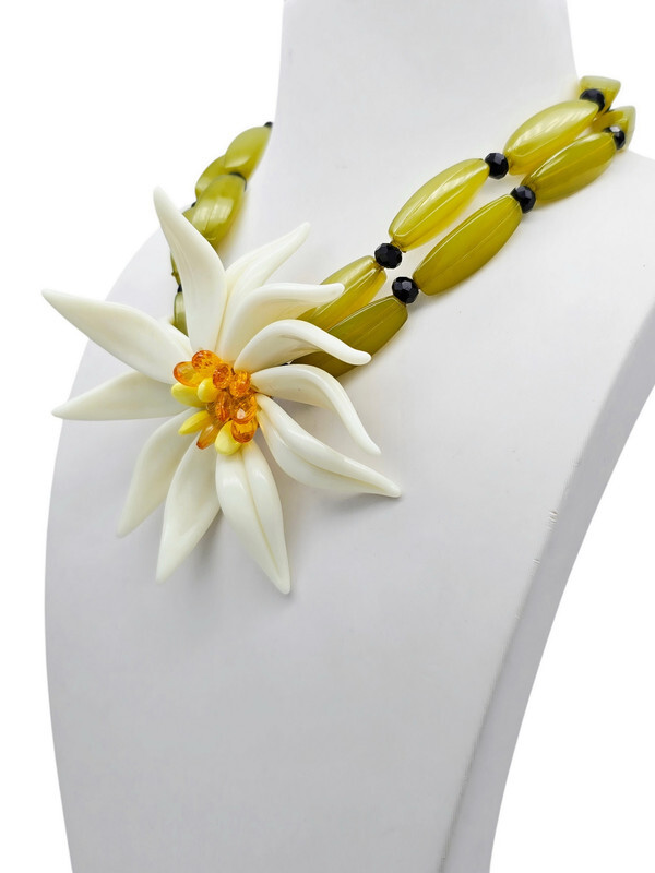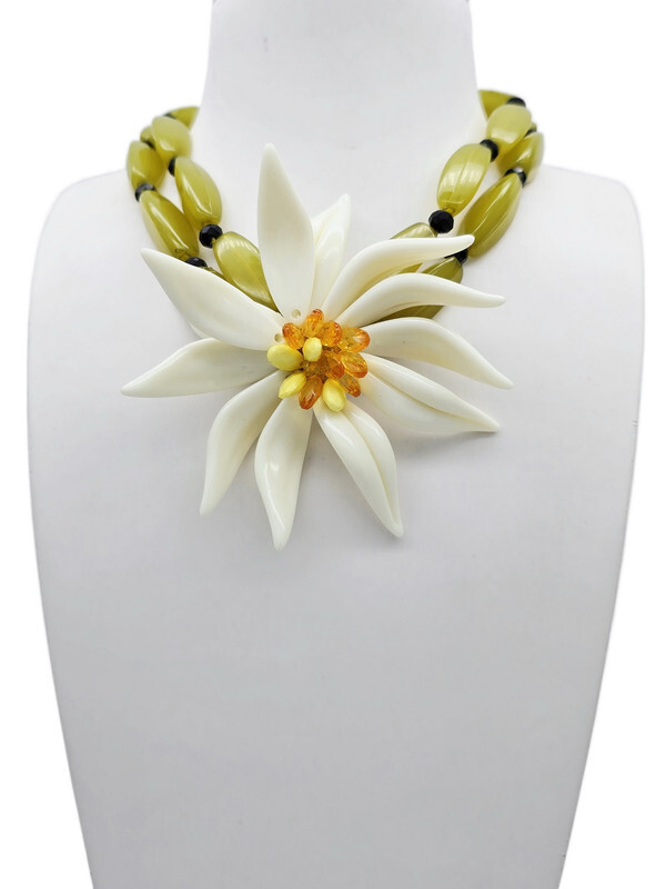 Хрустальное стекло, ацетат, ювелирная смола, ювелирный сплав. Гальваническое покрытие: золото.
