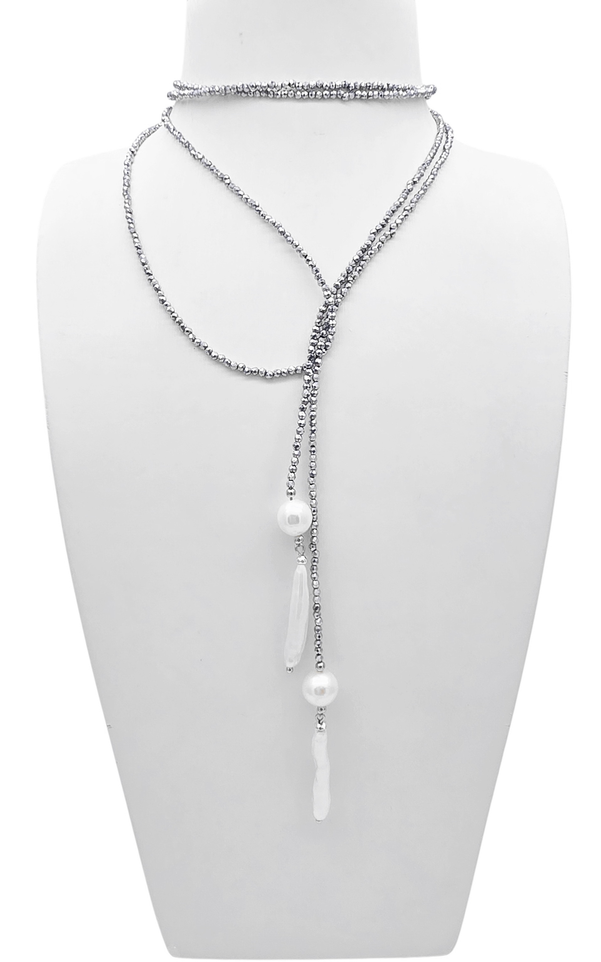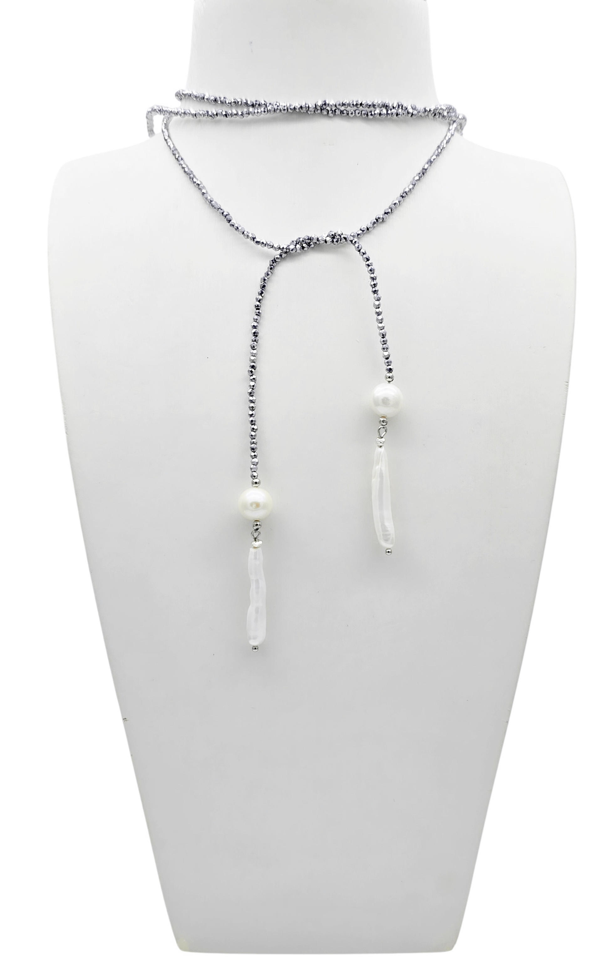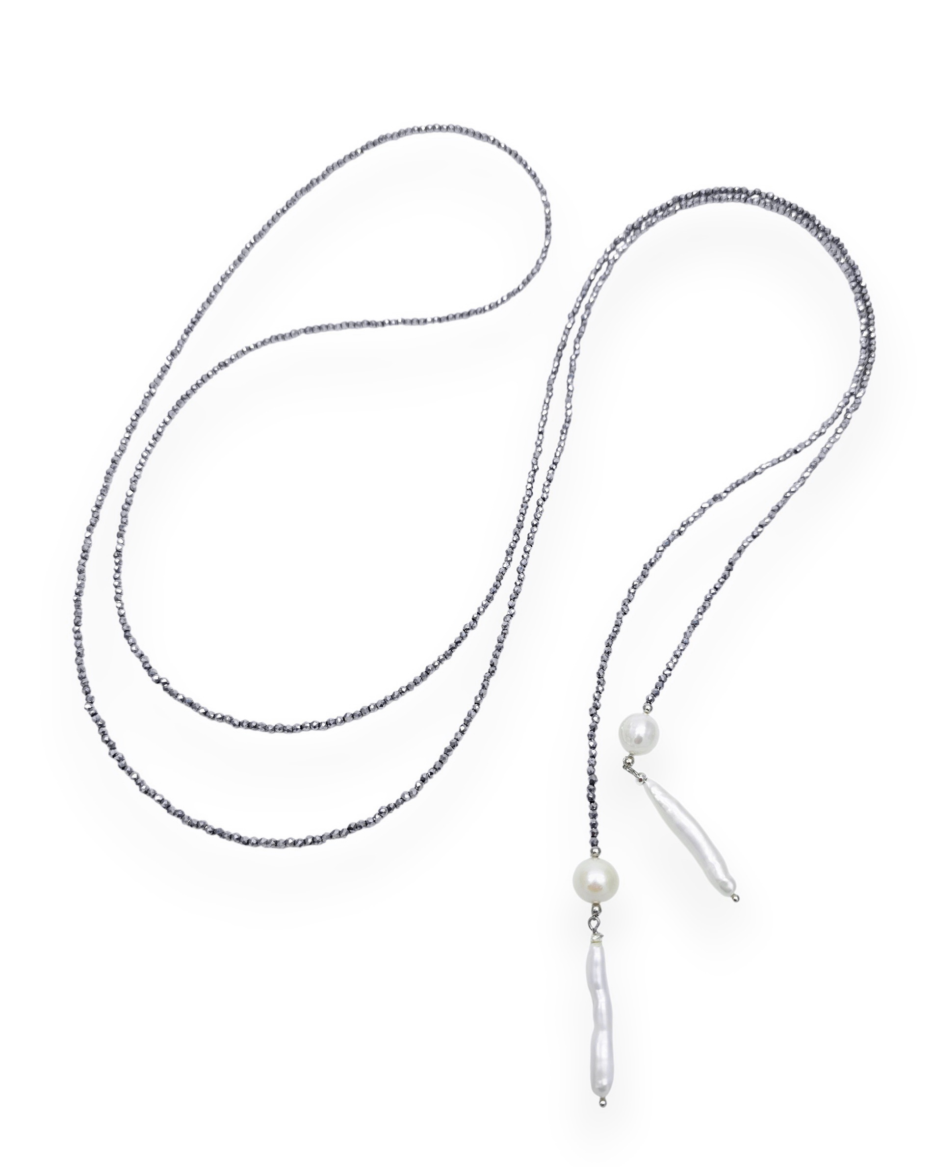 Длина колье 147 см. Жемчуг 9 - 11 мм, 5*25 мм, марказит 2 мм.