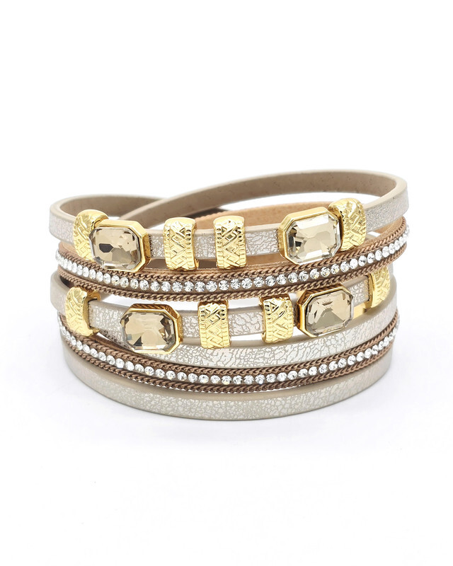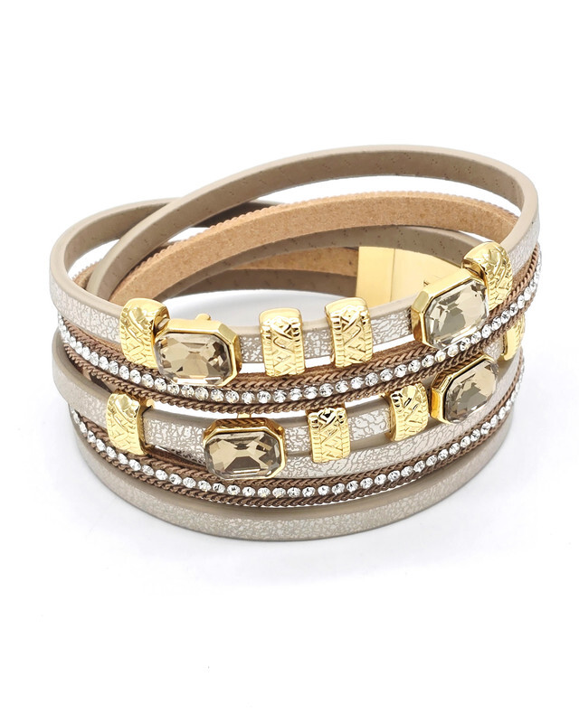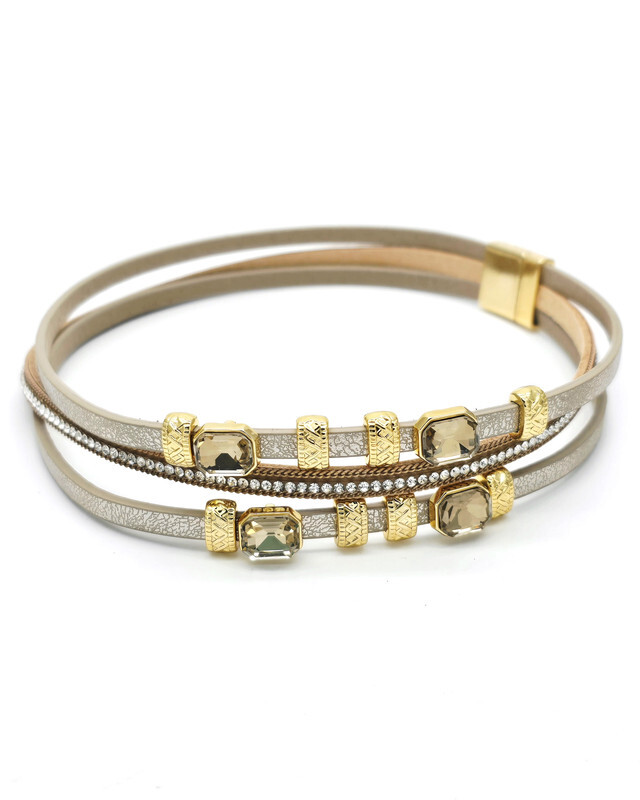Искусственная кожа, хрустальное стекло, ювелирный сплав. Гальваническое покрытие: золото.