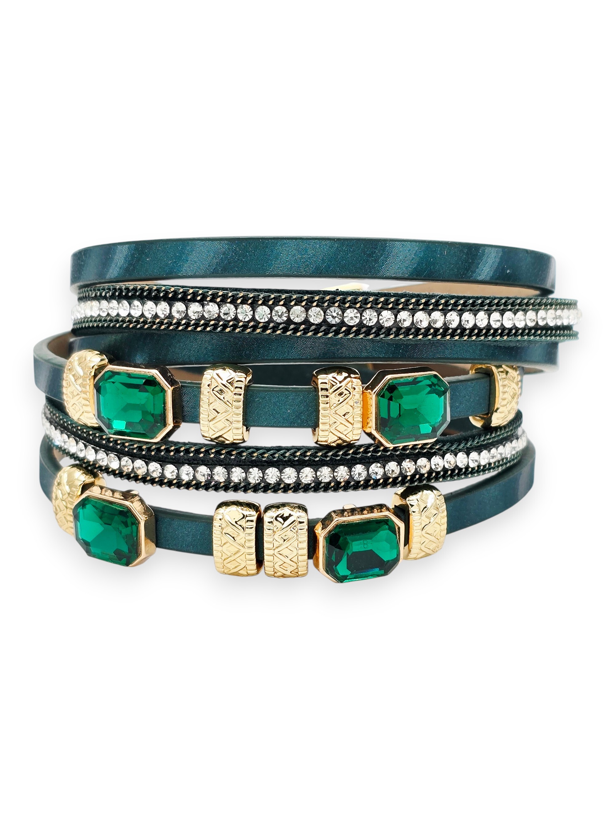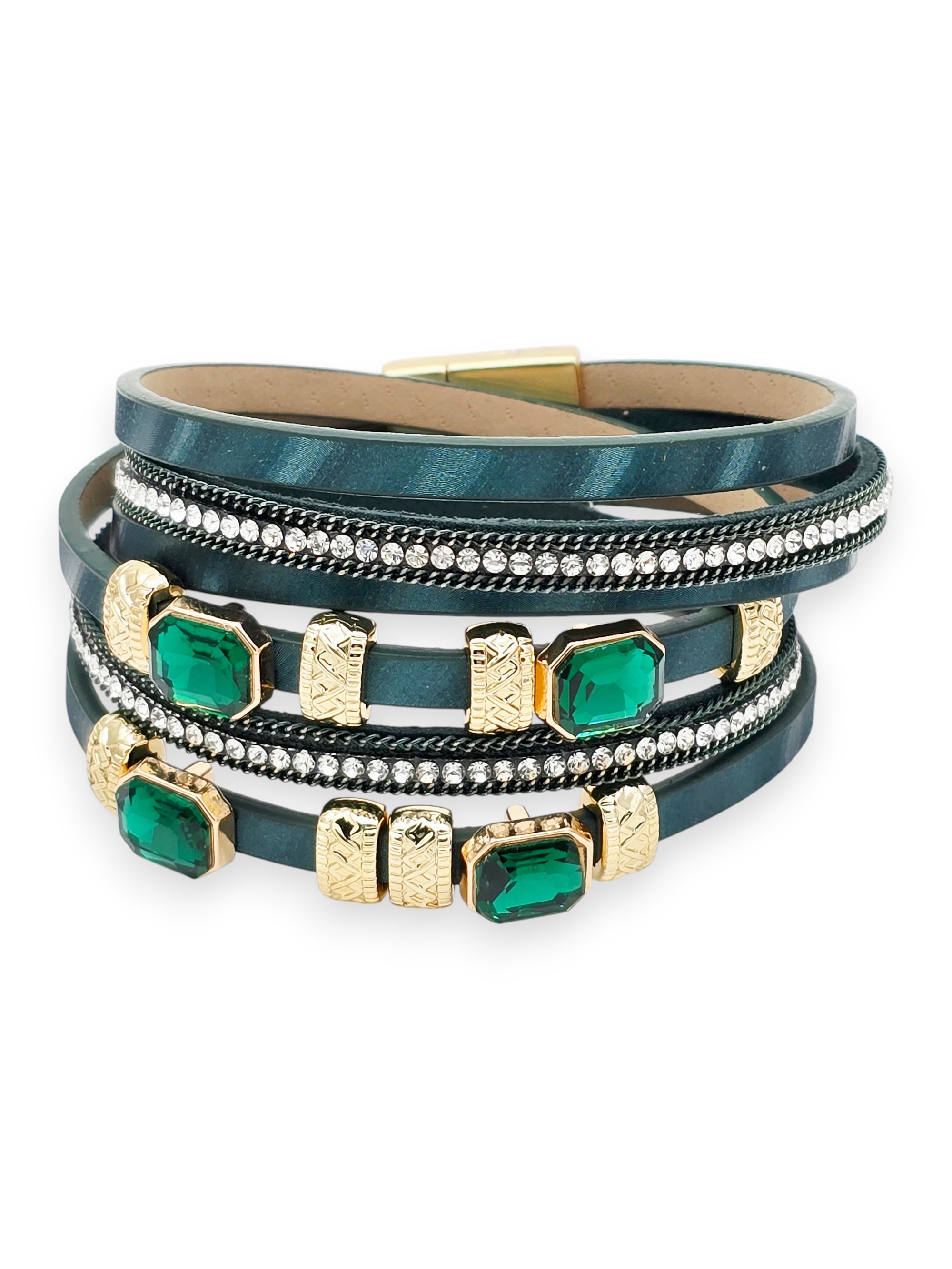 Искусственная кожа, хрустальное стекло, ювелирный сплав. Гальваническое покрытие: золото.
