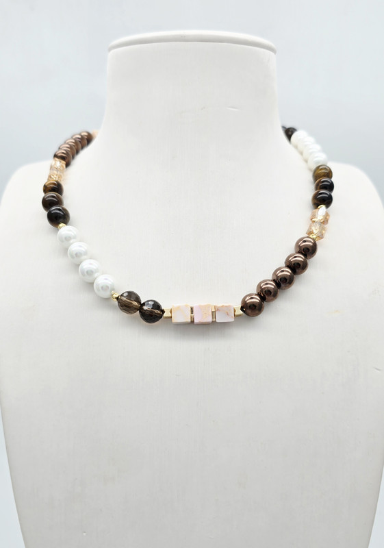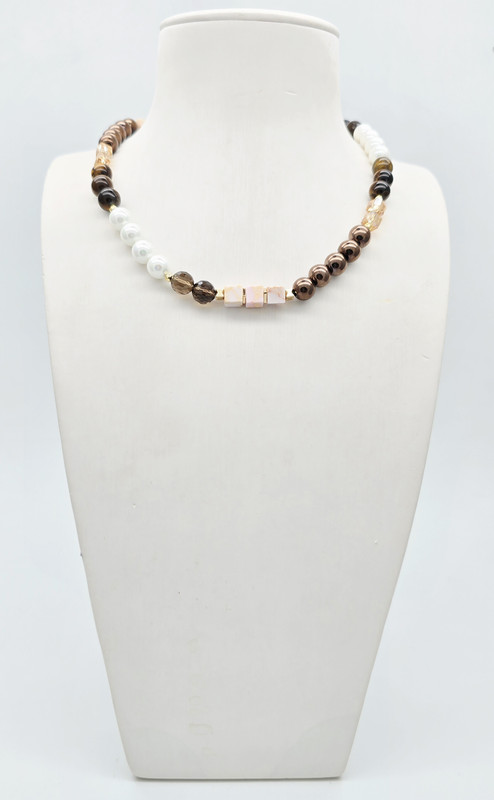 Длина колье 40 - 46 см. Жемчуг Майорка 8 мм, тигровый глаз 8 мм, гематит 8 мм, варисцит кубик 6 мм.