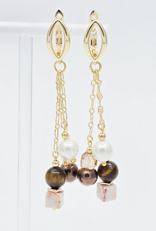 Длина серег с учетом швенз 7,3 см. Жемчуг Майорка 8 мм, тигровый глаз 8 мм, гематит 8 мм, варисцит 6 мм.